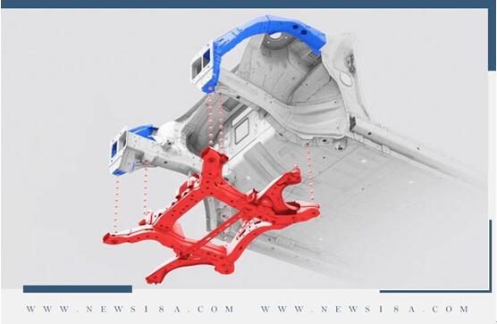 当车辆发生正面撞击时,车辆前方位置的撞击能量缓冲区会引导车身和底盘等框架结构变形,吸收能量缓解撞击力。在E-GMP平台中,仪表盘前方位置的承重支撑区采用了避险结构,可以最大限度地降低PE模块和高压电池组的冲击力。为了防止乘客保护区乘坐区域的变形,该平台还采用了A柱承重分散结构,并增强了前副车架的前端和车身之间的连接性。